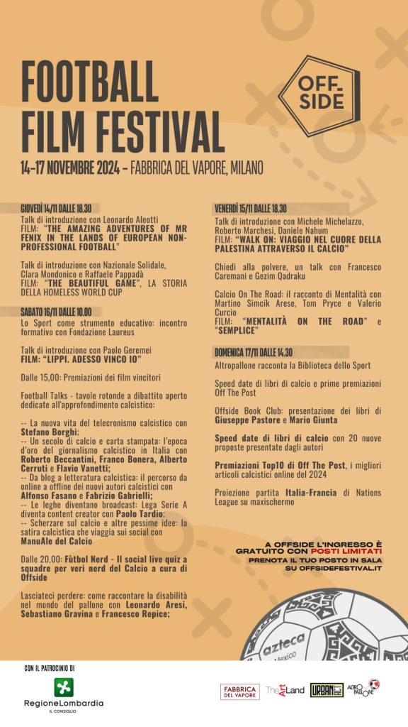 Il secondo giorno dell’Offside Festival 2024 è ricco di appuntamenti per gli appassionati di calcio e di storie che vanno oltre il semplice gioco. A Milano, presso la Fabbrica del Vapore, si susseguiranno oggi, venerdì 15 novembre, talk e proiezioni che esplorano il calcio come mezzo di connessione, identità e resistenza. Ecco cosa ci riserva il programma.