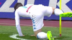 Poco sotto il podio troviamo un altro gol stupendo: allo stadio Marassi di Genova Mertens delizia i tifosi ospiti e di casa con un controllo palla i corsa perfetto su un lancio lungo di Diawara, defilato in area rossoblù, che fai, non tiri quasi come Totti contro la Sampdoria? La risposta è ovviamente sì, ma scagliando un sinistro potente nell’unico spazio possibile: sotto la traversa. Detto fatto ed esultanza iconica.