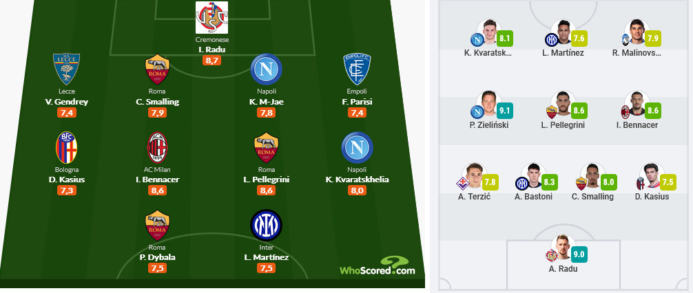 La differenza di modulo scombina totalmente però il partner di reparto. WHOS ha scelto Dybala, a cui è mancato forse solo il gol contro la Cremonese, mentre SOFA gli ha affiancato il tornado georgiano del Napoli e Malinovsky.