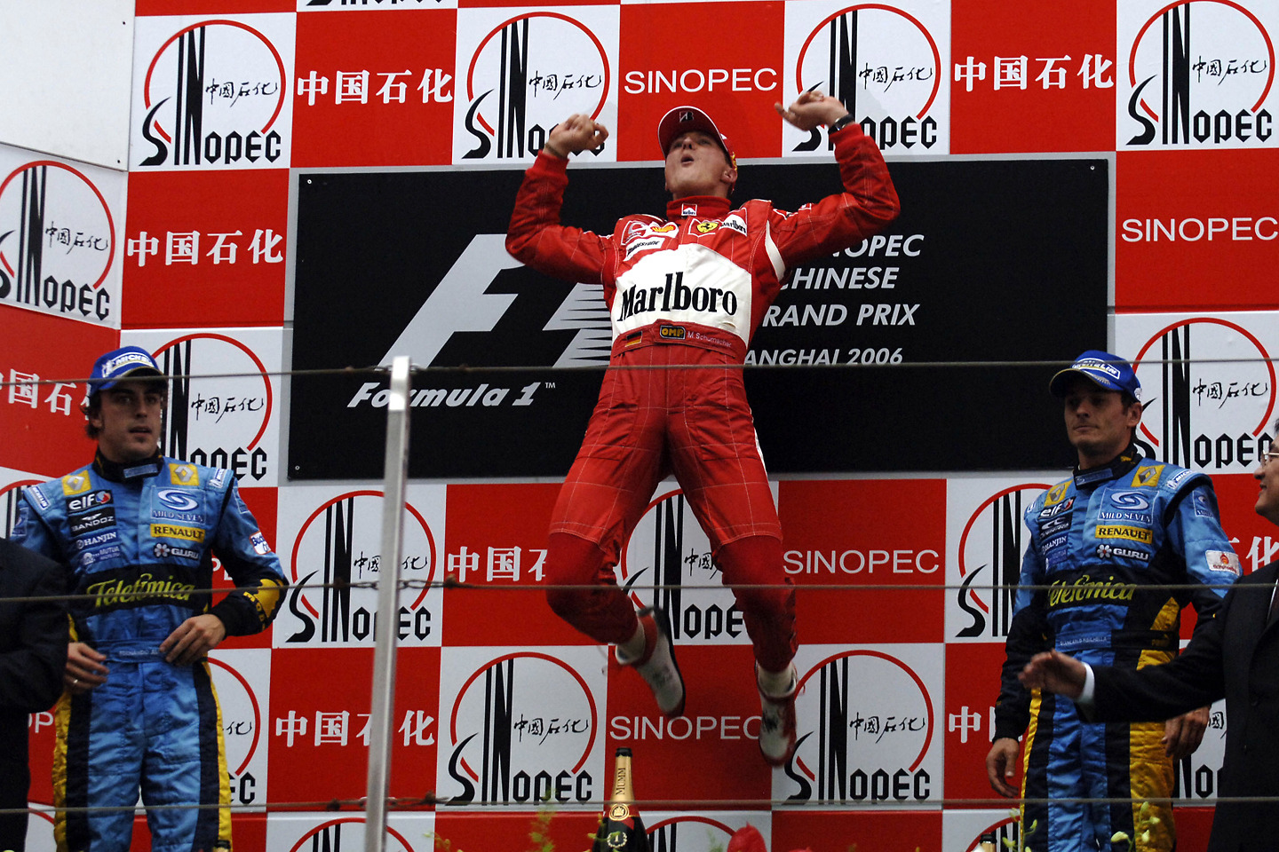 La 91esima perla di Michael Schumacher come pilota della Ferrari. Anno 2006, ormai l’era epocale della coppia Kaiser-Ferrari si è conclusa quando, nel 2005, a spodestare il re è Fernando Alonso con la Renault. Per Schumi è una vittoria sudata, conquistata dopo un duello ruota contro ruota proprio con l’asturiano. Anche in questa edizione l’asfalto della pista è bagnato dalla pioggia: nelle prime fasi Michael fatica con le gomme, mentre lo spagnolo inizia ad allontanarsi dopo essere partito dalla prima piazzola della griglia di partenza. Con la pista che man mano inizia ad asciugarsi, il ferrarista recupera terreno fino ad agguantare la prima posizione. La sua ultima prima posizione in carriera, accompagnato da Alonso e Fisichella. La prima edizione della storia del Gran Premio di Cina, invece, si può dire si possa raggruppare nell’era vincente della Scuderia. Era il 2004, Schumi era già leggenda da 5 stagioni e a salire sul gradino più alto del podio quella domenica sarà il fedele Rubens Barrichello.