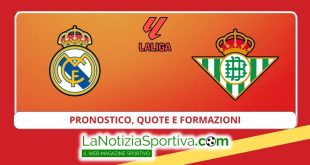 Real Madrid – Betis Pronostico aggiornato al 1 Settembre 2024, ore 21:30 – 1/Under 2.5/1X, NoGoal, Probabili formazioni e quote. Info e il pronostico di Real Madrid – Betis Ultimo precedente in Primera Division: Real Madrid 0-0 Betis; Luogo: Estadio Santiago Bernabeu, Madrid (Spagna); Data: Domenica 1 Settembre 2024; Ora: 21.30; Percentuali: vittoria Real Madrid 60%, pareggio 30%, vittoria Betis 10%; Primo tempo finale: X // (0-0); Multigol totale: 1-2 Goal; Handicap Asiatico: Real Madrid -1; Pronostico: 1 // Under 2.5 // 1X; Pronostico Goal/NoGoal: NoGoal; Previsione risultato: Real Madrid 1-0 Betis. REAL MADRID-BETIS: BLANCOS A CACCIA DEL RISCATTO, ANDALUSI …